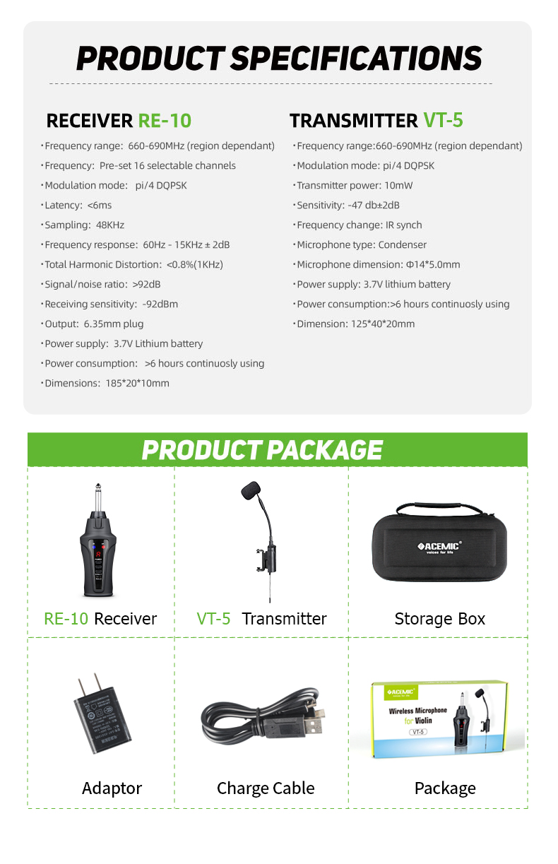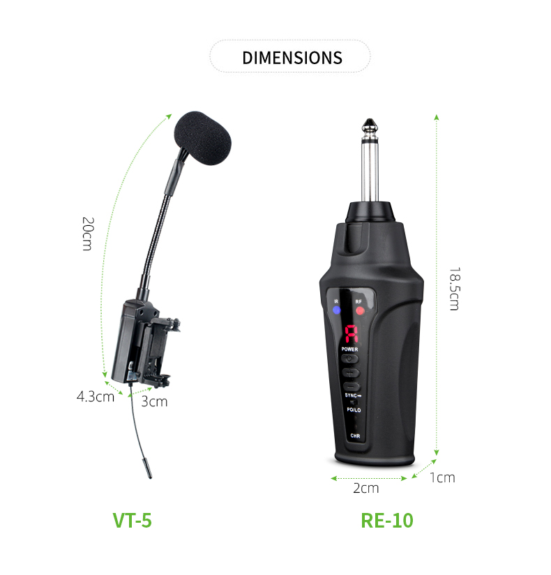 【99% Sound Reproduction】 The VT-5 wireless violin microphone ensures ultra-low audio latency (<6ms) and uses digital ID code technology to eliminate simultaneous frequency interference. It can use 4 microphone systems at the same time without crosstalk, with 16 presets With selectable frequency and unidirectional 0.55-inch condenser microphone core, musicians can choose and adjust different sound effects to capture the unique timbre and beautiful melody of the violin.