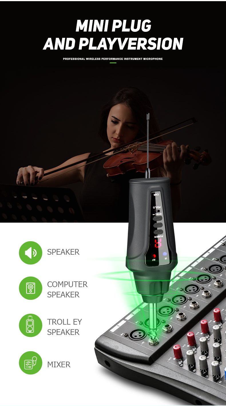 【Versatile Applications】Equipped with a 6.35mm plug (1/4-inch plug), the wireless violin microphone can be directly connected to various devices such as mixing consoles, audio speakers, computer speakers, and amplifiers. It is suitable for teaching, personal entertainment, indoor and outdoor small-scale performances, providing convenient audio connections and delivering a high-quality audio experience.