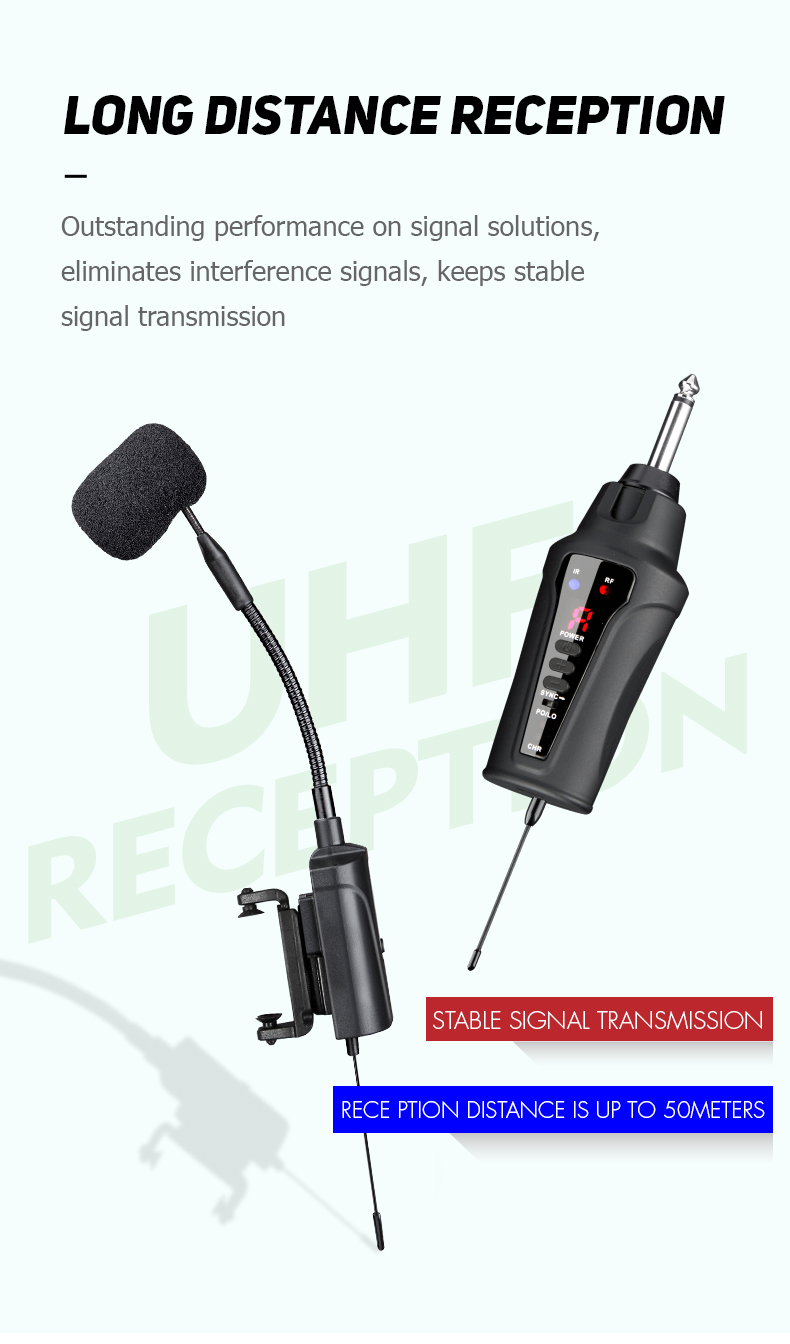 【164 Feet Wireless System】The wireless violin microphone utilizes infrared automatic frequency matching and UHF 600-928MHz digital audio transmission technology to provide freedom from the constraints of wired connections for traditional violin pickups. With an ideal operating distance of 164 feet and stable signal transmission.